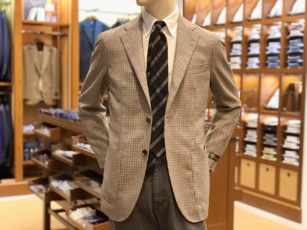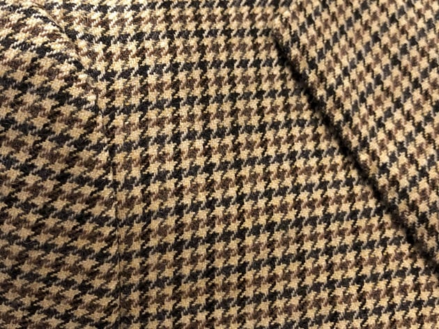 何気ないブラウン系のハウンドトゥース。ベースカラーはベージュと呼べるほど印象は軽快で、細かい柄ならではの遠目ソリッド感は、汎用性の高さが窺えます。