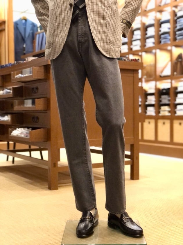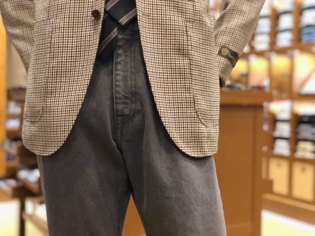 ウールサキソニー、またはウールフランネルのパンツといきたいところですが、残念ながら未入荷。せっかく〈AUBERGE(オーベルジュ)〉のかっこいいウォッシュブラックデニムジーンズが入荷している事だし、シャツをボタンダウンに変えて崩せばいいっか、なんて理由だけのスタイリング。タラタラ偉そうに書いていますが、私なんてそんなものです。