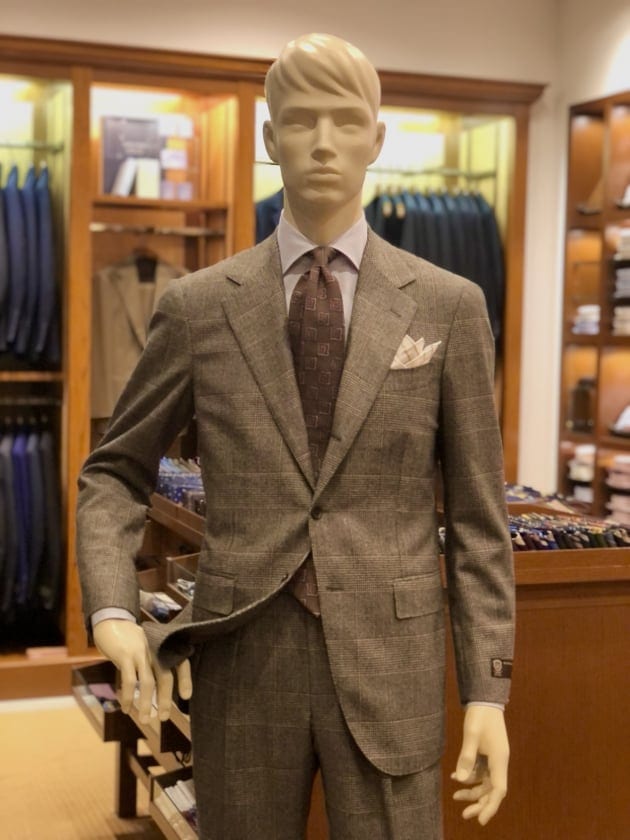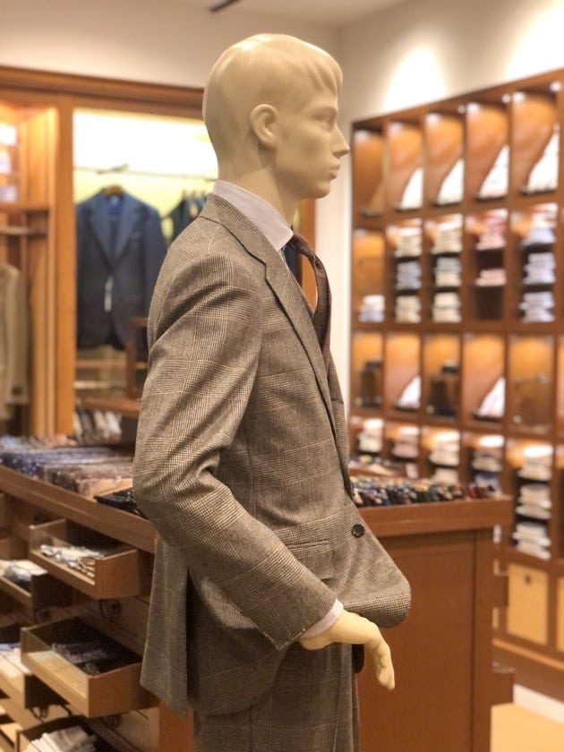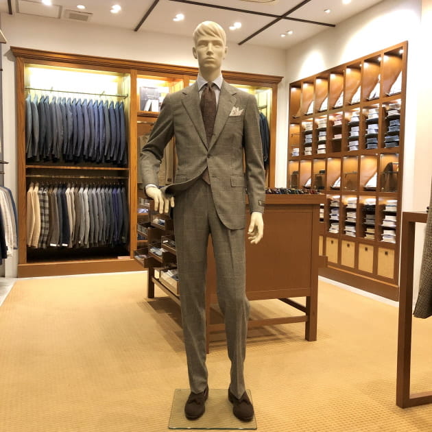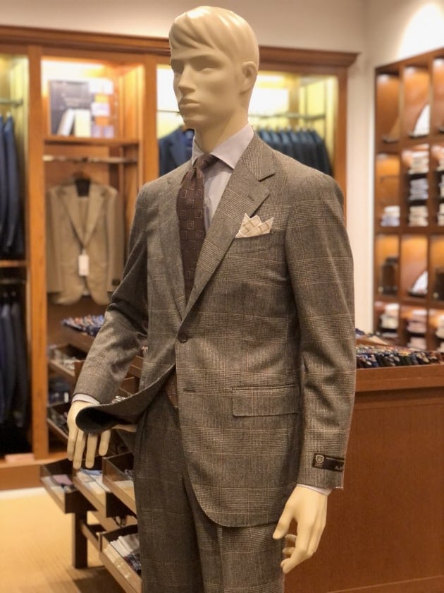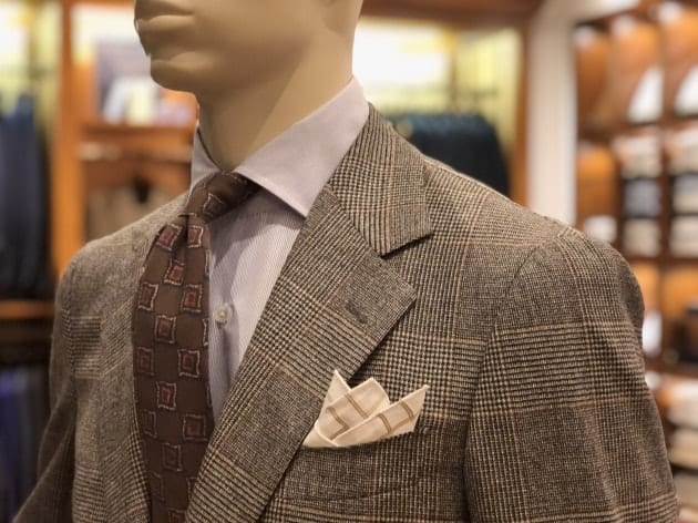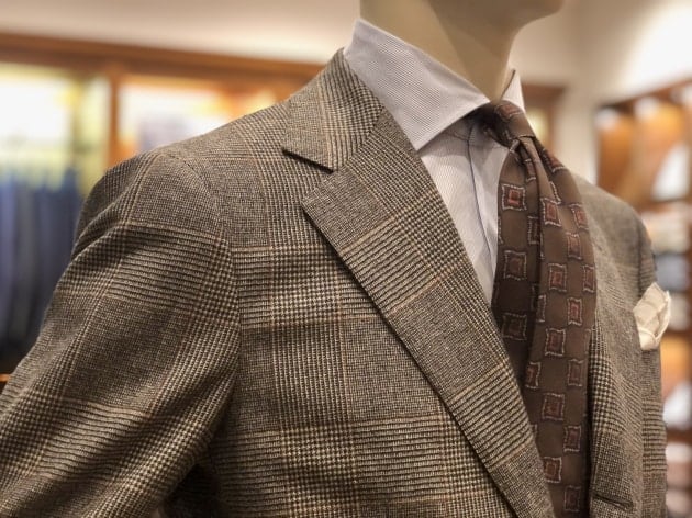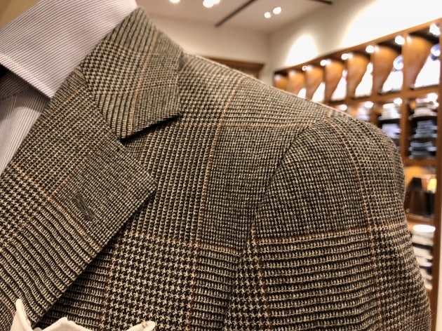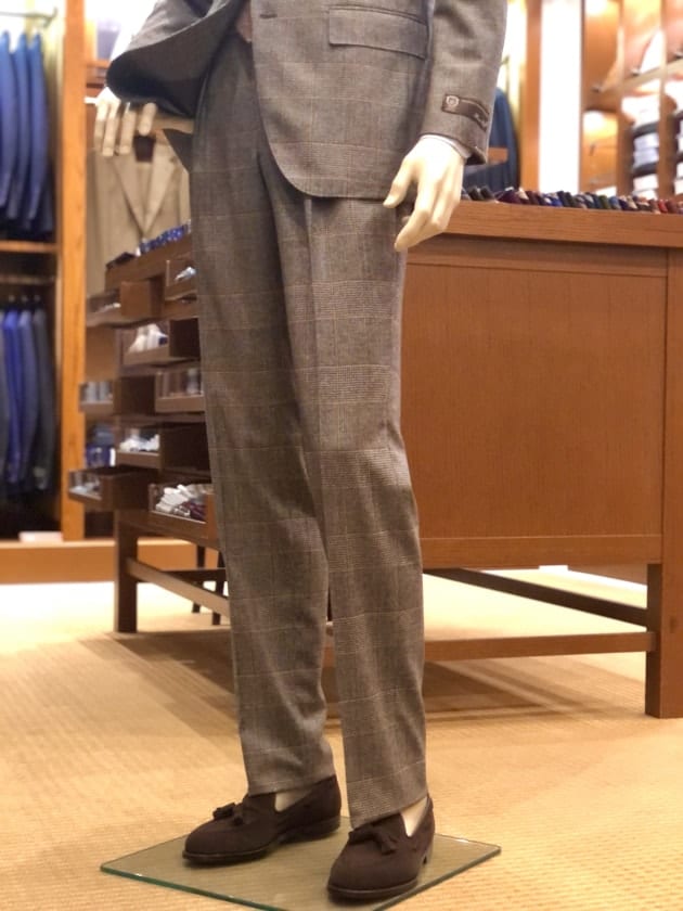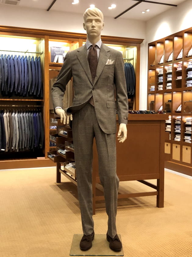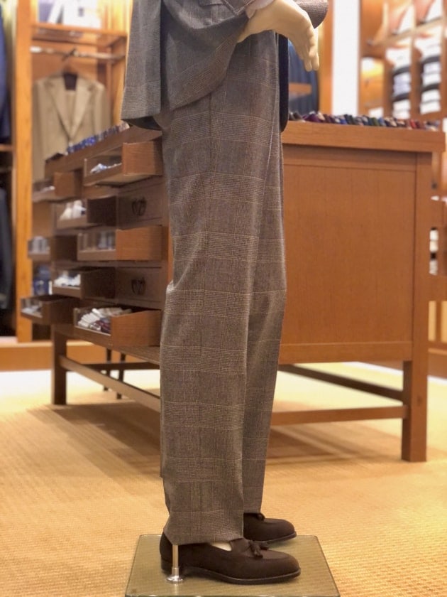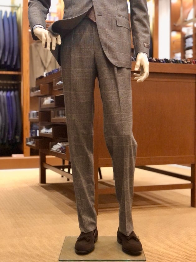 ダークブラウンベースのグレンチェックに、絶妙な配置のライトブラウンのペーンは、マスを縁取る事で色馴染が良く、ジャケット単品とは異なるスーツとしてのクラシカルな面持ちを保っています。