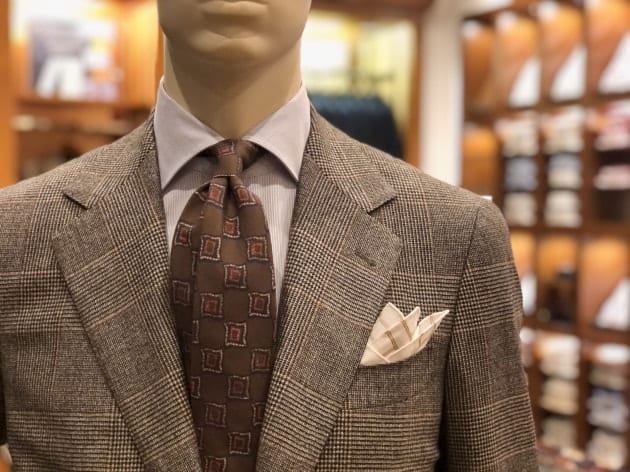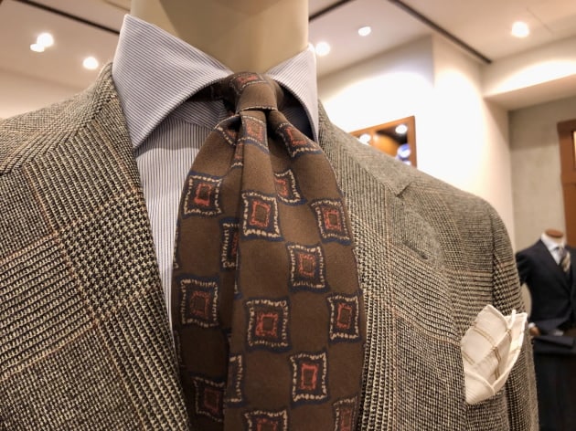 ブラウン系のスーツだからブラウン系のネクタイ…というのもあるのですが、柄は多用しても色数は抑えてちょっと拾ったコーディネートです。スーツのペーンの色とシャツのネイビーは、ネクタイの柄にも使われている色、というのがポイントです。