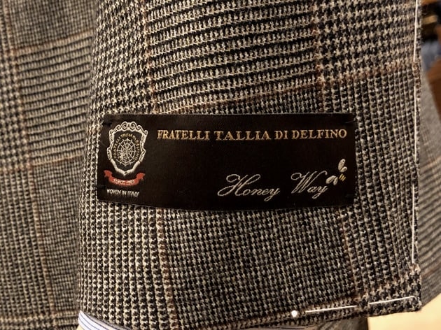昔から何故か私の琴線に触れるイタリアのTALLIA DI DELFINO(タリア ディ デルフィノ)社、Honey Way(ハニーウェイ)コレクションの生地です。ウールの織物のみならず、服地とされる生地の多くは、「織って、はい、できあがり。」ではありません。必ず「仕上げ」と呼ばれる生地を整理する加工が施されます。その工程において天然蜜蝋を使用する事で、環境に配慮した「仕上げ」を施し、且つ滑らかな風合いを表現しています。手間とコストのかかる作業工程です。
