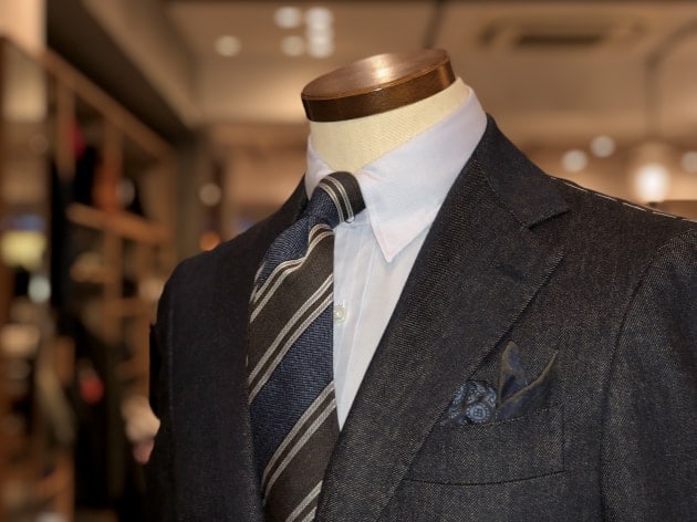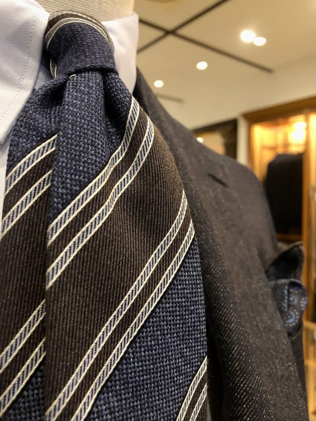 大切なのは、誠実な色と柄。そして、スーツとマッチする生地感のネクタイです。今回の〈Holliday & Brown(ホリデーアンドブラウン) 〉のネクタイは、ウール60%シルク40%の混紡。冬に多くなる表情豊かなスーツやジャケットには、ウールネクタイの質感や厚み、抑えられた光沢などがマッチします。