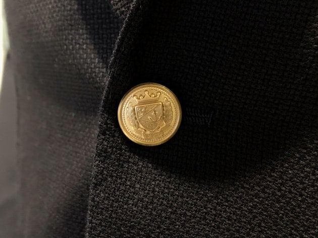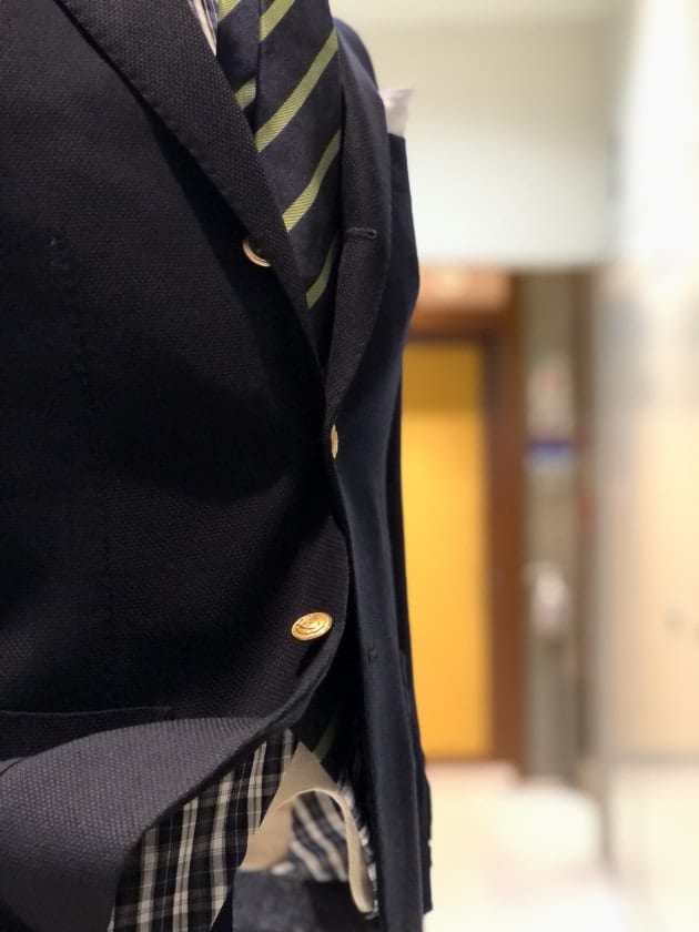 メタル釦に飽きたら、簡単に釦を代えられる利点もブレザーの良いところ。メタル釦を探し始めると、色や柄、形状が様々で、しかも地味に高い。大変ですよ。