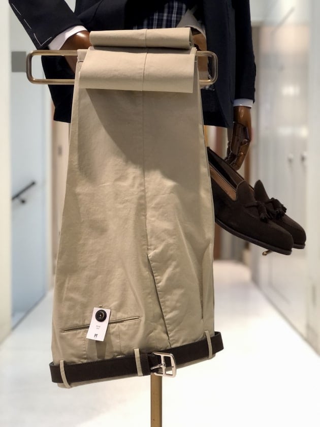 ベージュのコットンスラックスがストレート過ぎると感じる方は、グレイのトロピカルウールスラックスが実用的です。