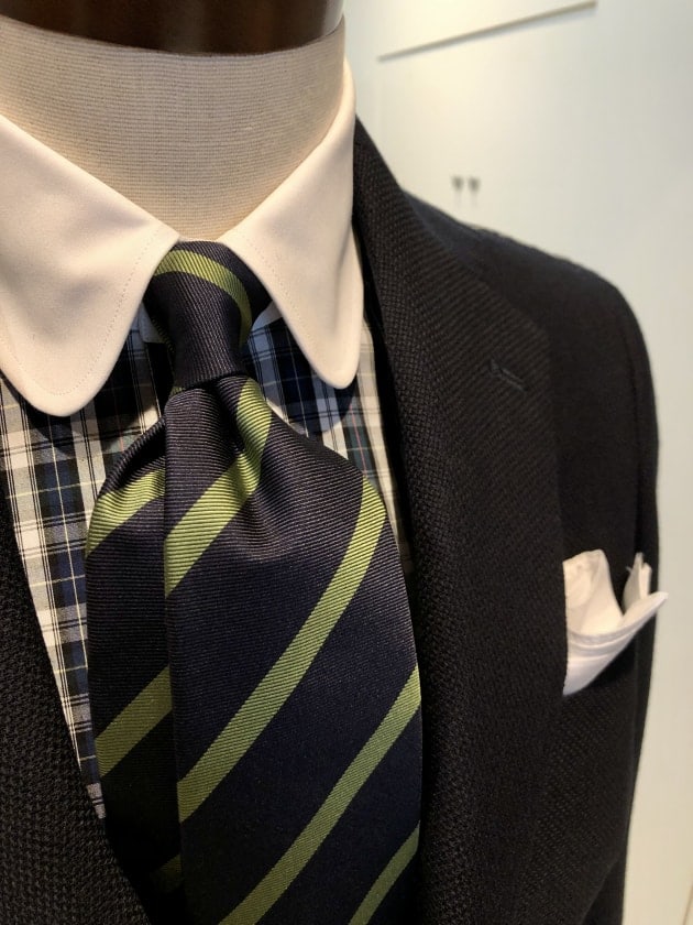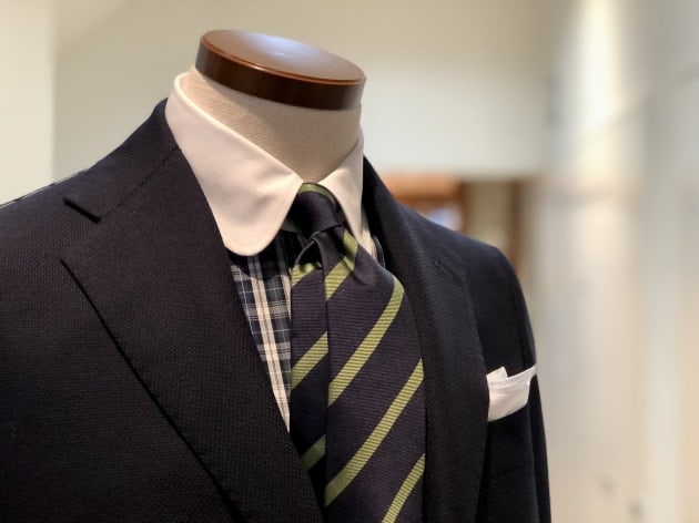 シャツの基調色であるネイビーとグリーンから素直に色を拾った、同じく〈BEAMS F〉のストライプネクタイで色を纏めました。