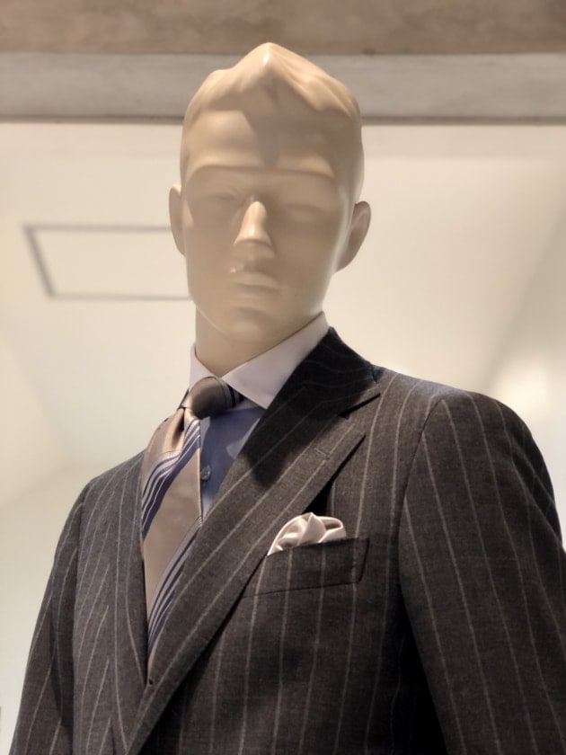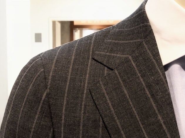 更には、2.3㎝ピッチのチョークストライプが慎ましくも独自性を併せ持ち、毅然とした上司を思わせる頼り甲斐のある柄です。
