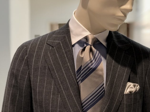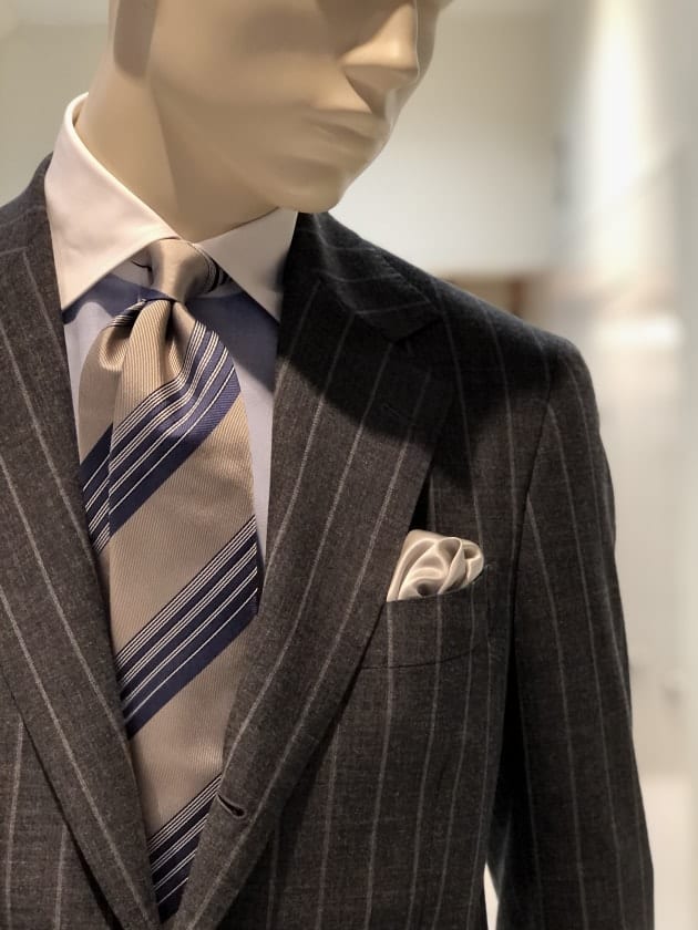 店頭に並ぶ小紋柄のネクタイのほとんどがマッチする中、威圧感を抑えて、弾むような爽快感とエレガントな雰囲気を重視したストライプのネクタイを選びました。