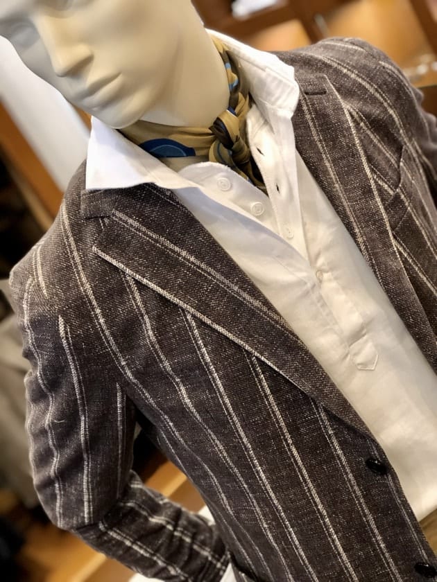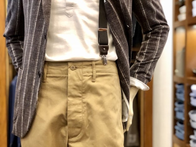 本当のワーカー達は、このような高級なブレイシーズは…もとい、あえてサスペンダーと言いましょう。ラギッドって、サスペンダーをしているイメージありますよね。もっといくならキャスケットを被るとか、チャッカーブーツを履くとか、いやいやそこまでは…という方は、ヘンリーネックTシャツを脱いで、リネン混のベルトレスパンツやジーンズ、イージーパンツでも良いと思います。