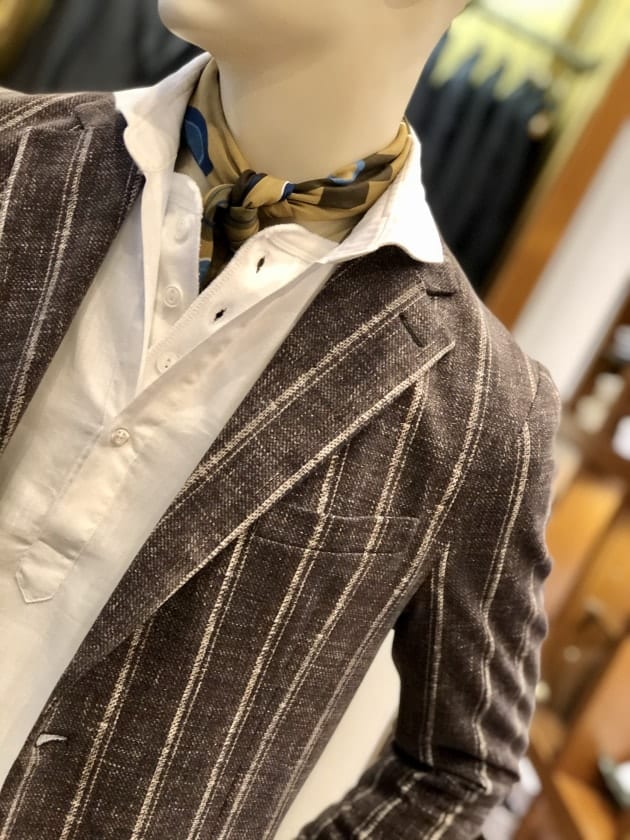 〈ORIAN(オリアン)〉のプルオーバーシャツは、リゾートな表情が魅力であると同時に、汎用性や可能性を秘めています。ワークで男臭く見せる為に、ヘンリーネックのTシャツをあえてインナに、そして、大人の上品さを追加する為に、ネッカチーフも入れ込みました。