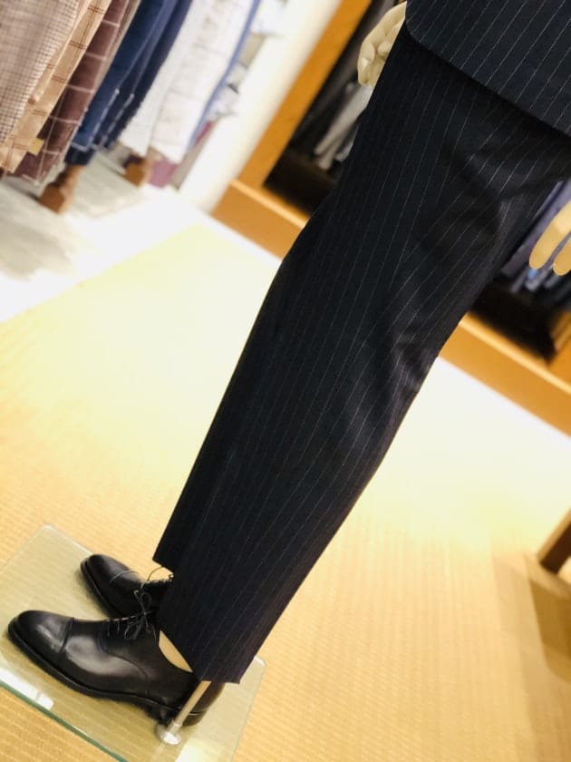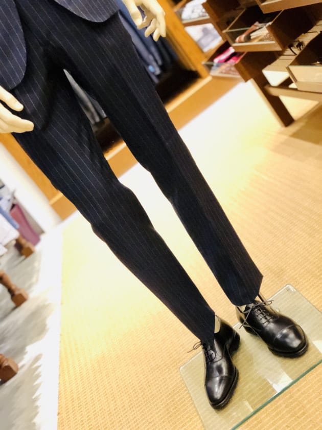 パンツも安定して美しいシルエットです。モンクストラップやローファーではなく、正統派のストレートチップシューズです。