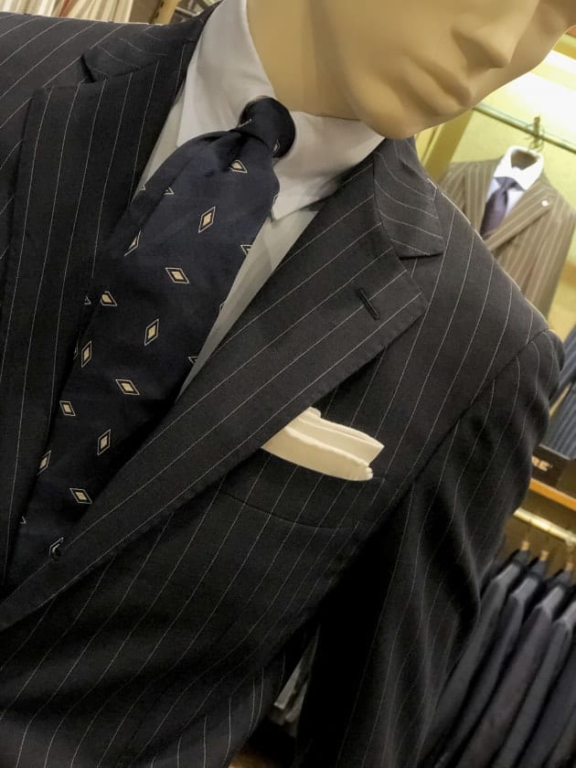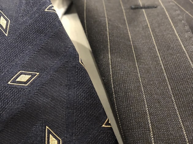 ネクタイもダイヤ柄に加え、ベースにシャドーで柄が入ります。屋内ではわかりづらいですが、屋外では太陽光に反射され、立体的な表情が浮かび上がります。