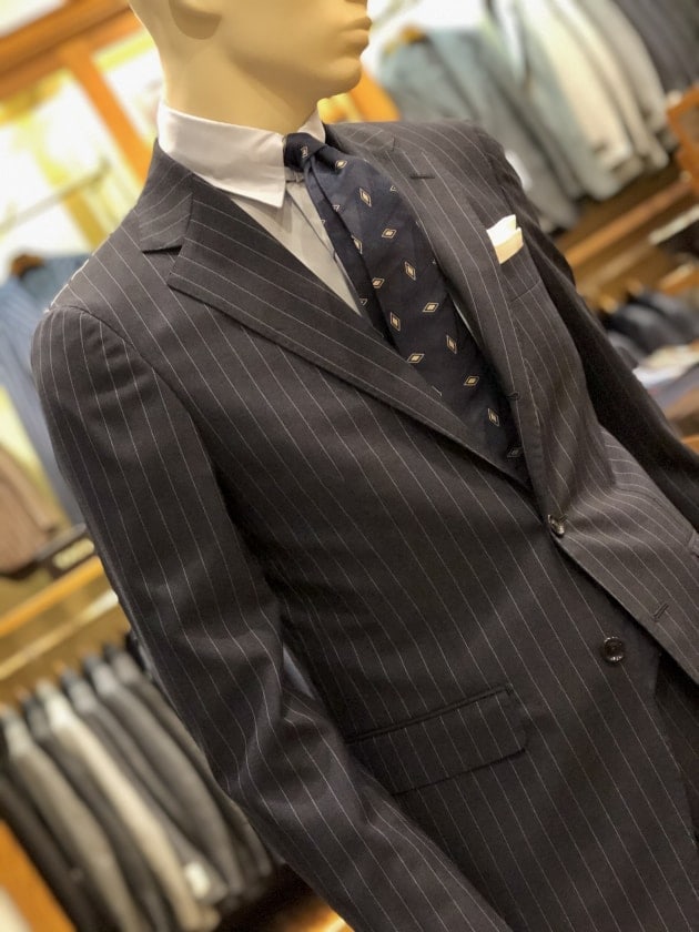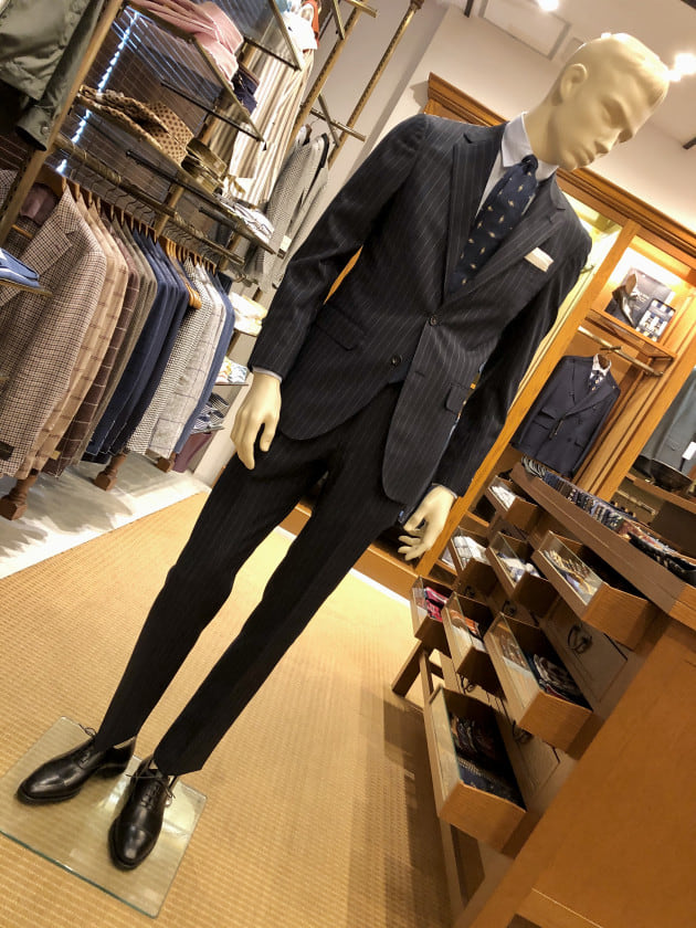 〈BEAMS F(ビームス F)〉オリジナルスーツです。青みのあるネイビーをベースに、1.5㎝幅のペンシルストライプがしっかり走ったビジネス対応のスーツは、どのようなシーンにも適応能力が高く、スーツの「個」を主張しない故に、ご自身の「個」を引き立てます。