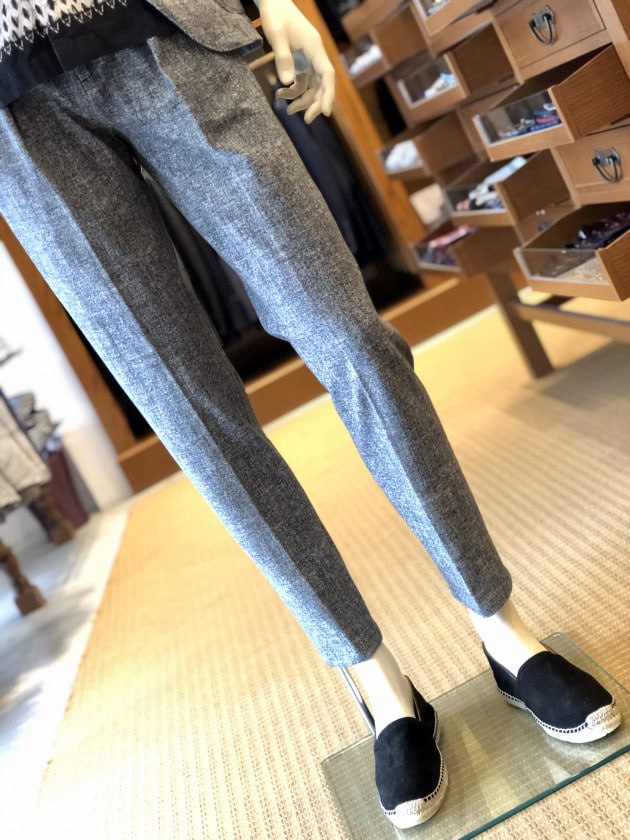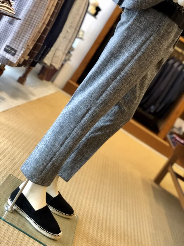 ジャケットと共地のパンツです。スッキリとしたシルエットですが、ジャージーが故に大変履きやすく、ドローコードが更にその雰囲気を引き立てます。セットアップだけではなく、セパレートに活躍できる素直なパンツです。