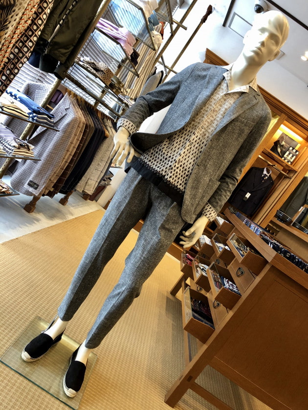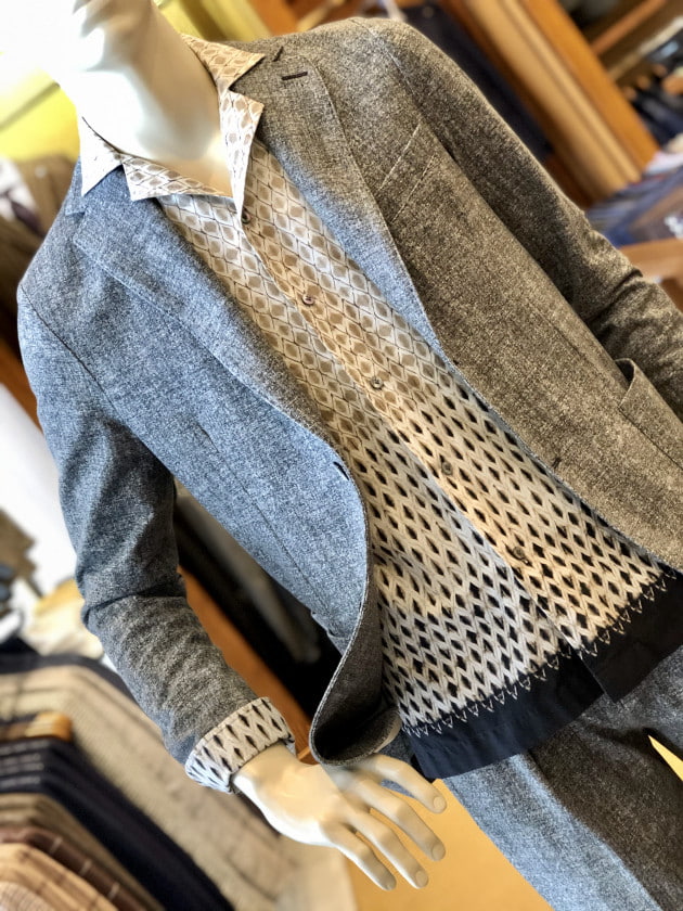 そして、キワモノプリントの〈BAGUTTA(バグッタ)〉のオープンカラーシャツです。ダイヤ柄とご紹介していますが、パイソンとも取れるワイルドな柄を1枚で、または今回のように、リラックス感のあるジャケットのインナーにタックアウトしても良いと思います。