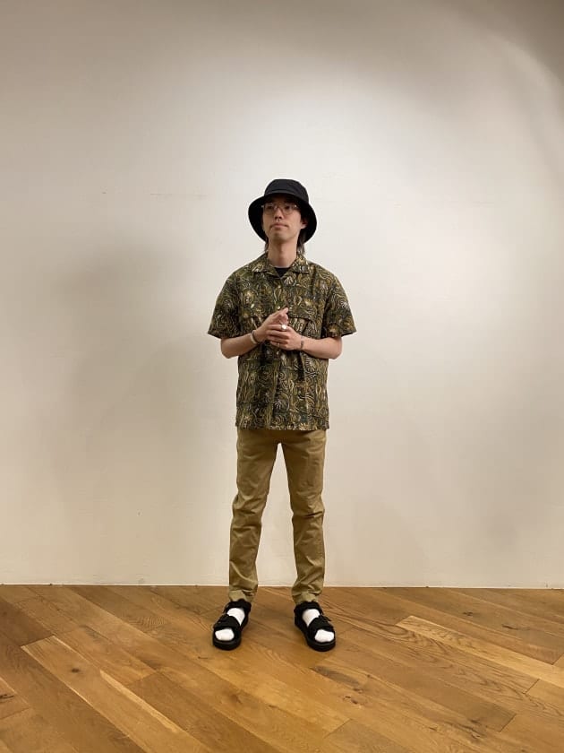 涼しげな柄シャツにビームスでは定番のストレッチテーパードチノを合わせ