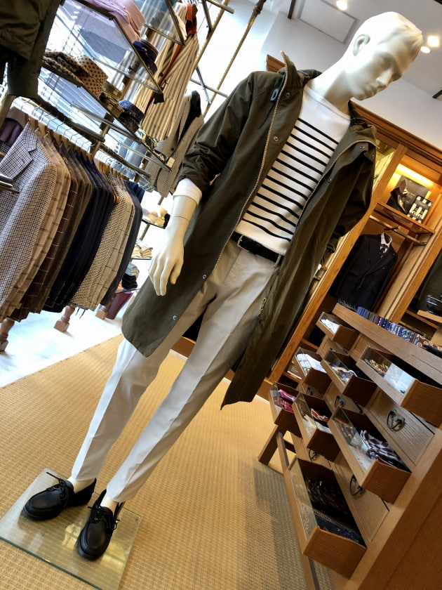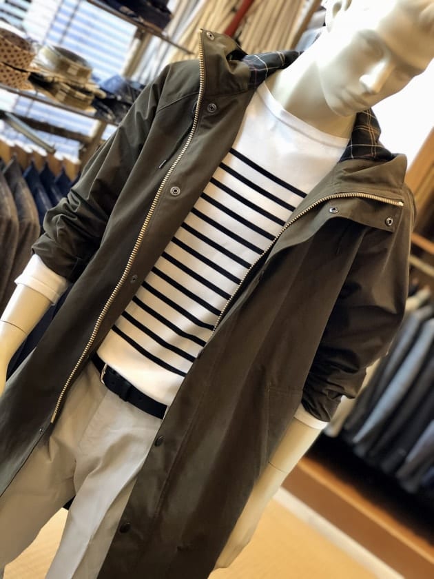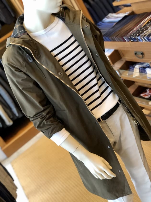 スーツやジャケパンにあえて〈Barbour(バブアー)〉のハンティングコート、というのはよくある崩し方ですが、都会的なマリンルックをハンティングコートという山のもので男らしく崩しました。