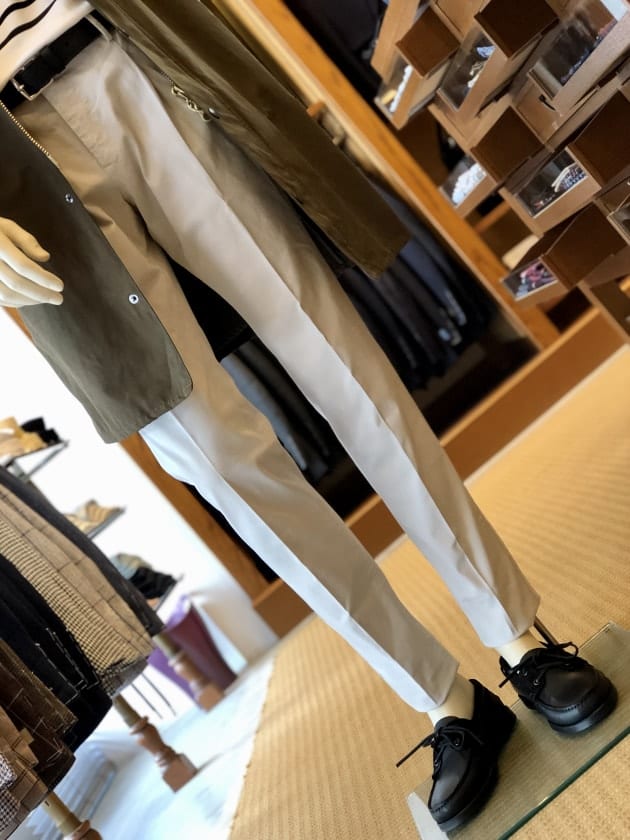 誤解を恐れず言うならば、少し古臭いダサめの着方が新鮮で、特にパンツのこのオイスターカラーが肝です。〈PT TORINO(ピーティー トリノ)〉のスリムフィットモデルEVO FIT(イーヴォフィット)のパンツは、1プリーツでありながら細身のシルエットがお好きな方にお勧めのシルエットです。多くはビジネスパンツとしてのご提案ですが、カジュアルとしてフレンチアイビーを匂わせるカラーリングがとても新鮮です。