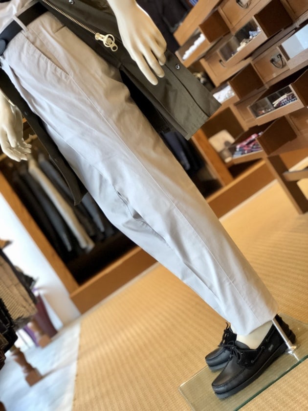 先述の通り、こちらがオイスターカラーのコットンパンツです。その名の通り、「牡蠣」を意味していて、ホワイトに限りなく近いグレイというか、オフホワイトとは違うもっと無機質な印象です。〈Anderson’s(アンダーソンズ)〉のグレインレザーベルトは、華美なバックルと革の質感、幅がとても上品でありながら堅すぎないところが、今回のコーディネートにマッチしている、と考えました。〈Paraboot(パラブーツ)〉のスエードとコンビネーションのデッキシューズは、やはり都会的マリンルックには欠かせないアイテムです。