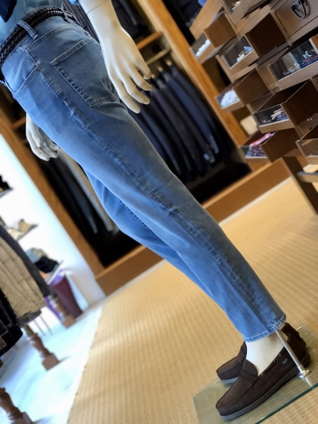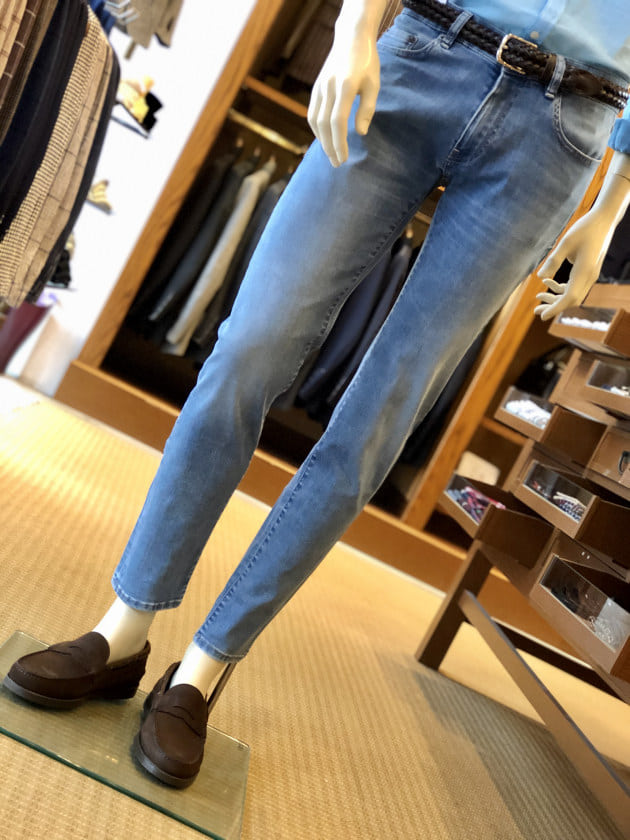 〈GIANNETTO(ジャンネット)〉のとても綺麗なブルーのシャツです。上に羽織らせるのはもったいないくらい美しかったので、コットンニットを肩から引っ掛ける程度にしておきました。カラーステイが取り出せますので、この手のシャツはカラーステイを抜いて、綺麗な襟のロールを是非楽しんでいただきたいです。