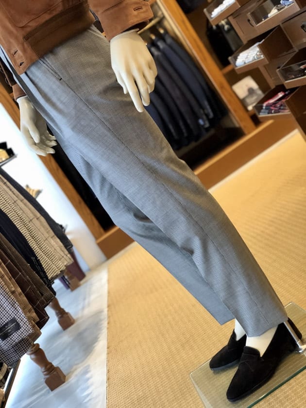 〈GTA(ジーティーアー)〉のベルトレスモデルHERRICK(エリック)です。トラベルな生地率でありながら、ハウンドトゥースというクラシックな柄が上半身にマッチしました。もちろんビジネス対応も可能ですが、ベルトレスを生かして、今回のようなカジュアルな装いにも対応可能です。仮にブルゾンをお脱ぎになっても、素敵な大人の男性の雰囲気が滲み出ると思います。