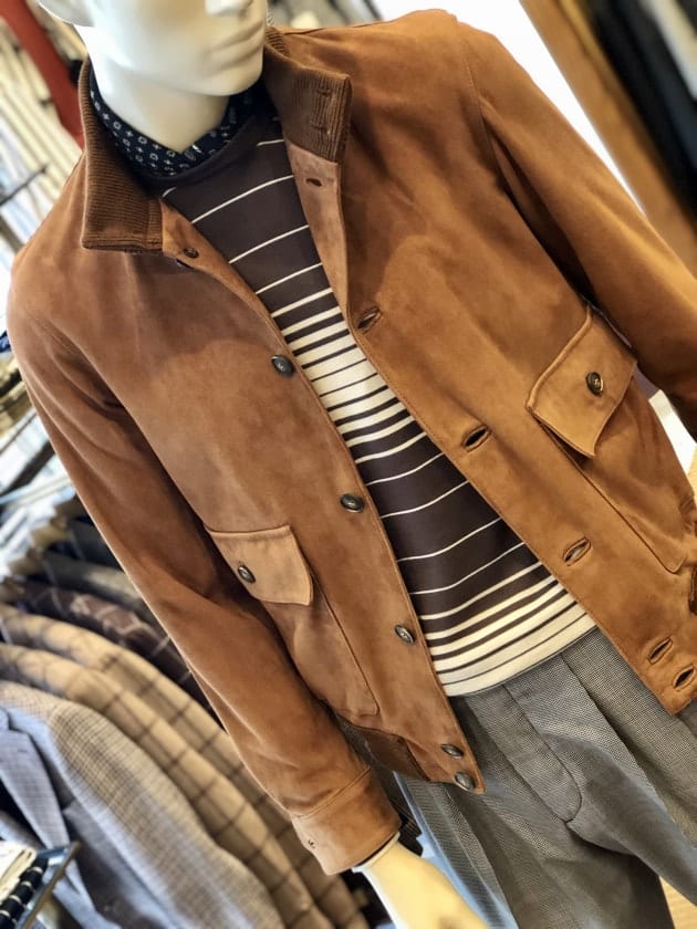 〈CINQUANTA(チンクワンタ)〉のゴートスエードドライビングブルゾンです。既にVol.38でもご紹介しましたが、今回は、〈ANDREA FENZI(アンドレアフェンツィ)〉のマルチボーダーのクルーネックニットと組みました。ブルゾンから感じる上品な雰囲気はそのままに、上質なコットンニットが更に格を上げ、ボーダーが全体に柔和な印象を与えます。