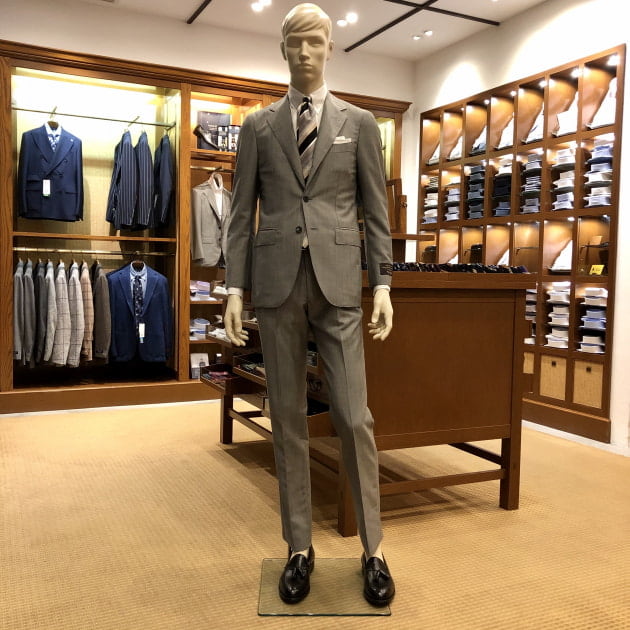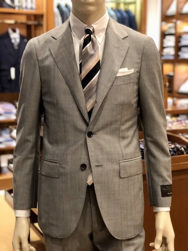 〈BEAMS F(ビームスF)〉のウール73%モヘヤ27%のスーツです。シルク混紡のまったりとした上品な光沢感と違い、モヘヤ混紡の光沢感には、毛1本1本が自己主張するかのような煌(きら)めきがあります。加えて、春夏らしい明るいグレイソリッドは自由度が高く、数多(あまた)のスーツに袖を通されてきたハイキャリアの皆様にこそ、お似合いになるスーツと言えます。