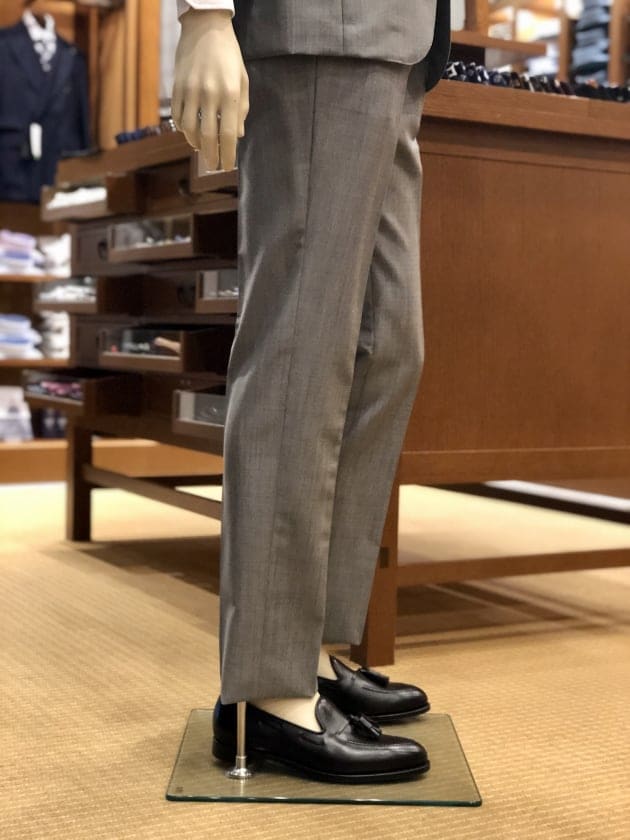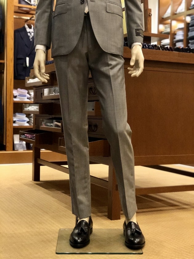 多用はあまりお勧めしませんが、グレイのパンツは単品としても使えます。ネイビー系のジャケットはもちろん、ブラウン系、パープル系、グリーン系などのジャケットにも対応可能です。多用をお勧めしない理由は単純です。パンツのみ使用頻度が多くなると、摩耗などの傷み、クリーニングの頻度が多くなる事での風合い、色合いの変化などが起こり、気付けばジャケットと全く違う触感や色合いになる恐れがあるからです。そして、ジャケットだけが取り残される…。恐怖です。でも、そうなったらそうなったで、その時は取り残されたジャケットと別のパンツのコーディネートを考えましょう。