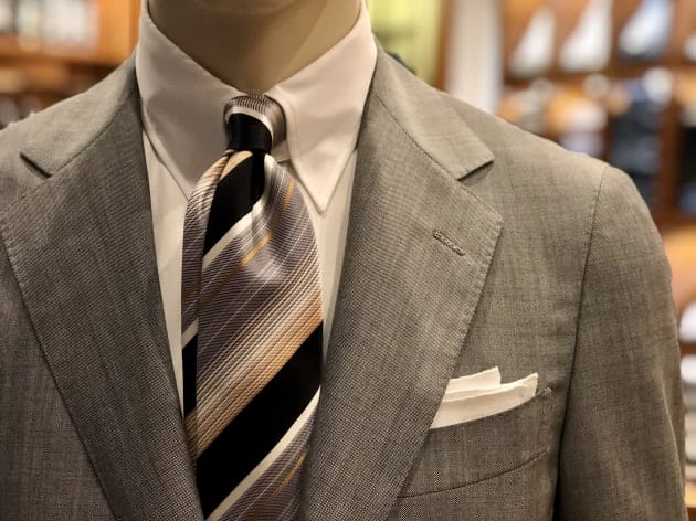 スーツと抜群の相性を感じた〈FRANCO BASSI(フランコバッシ)〉のストライプのネクタイは、ブラックとグレイをベースカラーに、ゴールドの挿し色が効いたヴィンテージとモダンを融合したような今年らしいネクタイです。