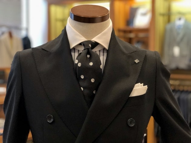 〈TAGLIATORE(タリアトーレ)〉の6つボタンダブルブレストスーツです。GEORGET(ジョーゼット)織りの高級感、繊細な光沢と肌触りは、ブラックでダブルブレストというフォーマルな仕様に乗って、更に高貴と気品に溢れています。また、今回は秋冬品としてのご紹介ですが、本来は通年でお召しになれますので、半裏背抜きという仕様と相まって、あらゆる場面で活躍すると思います。本当はブライダルやパーティーシーンに最適…と言いたいところですが、それが叶わない現実故に、ビジネスシーンでの活用をイメージしました。ブラックスーツをビジネスシーンで着るのは日本人だけ…みたいな皮肉とも取れる話はよく聞く話ですが、ならばブラックスーツをビジネスシーンでカッコ良く着られるのは日本人だけ、と言われるようになれば良いだけの話です。