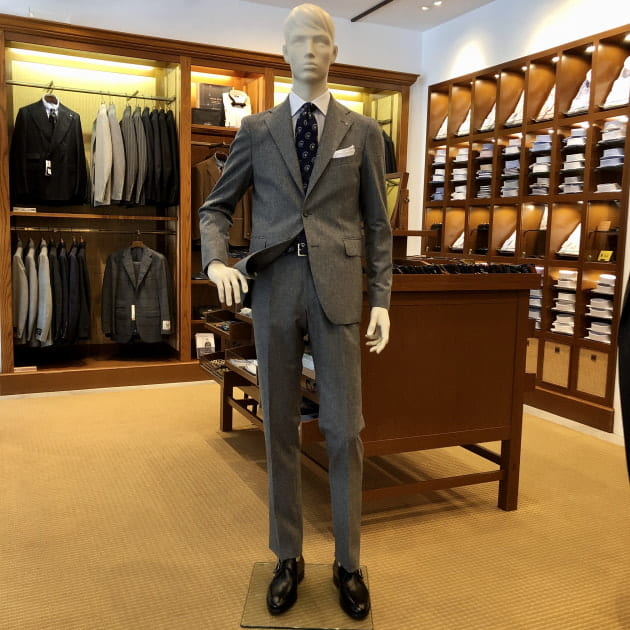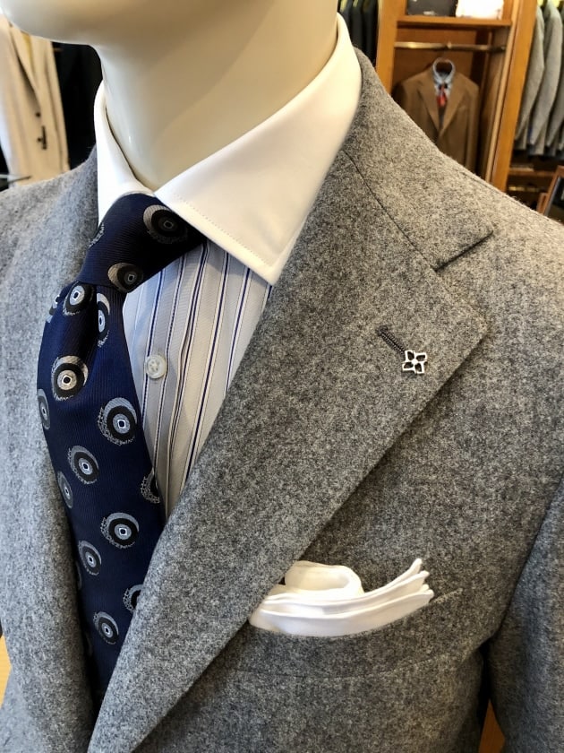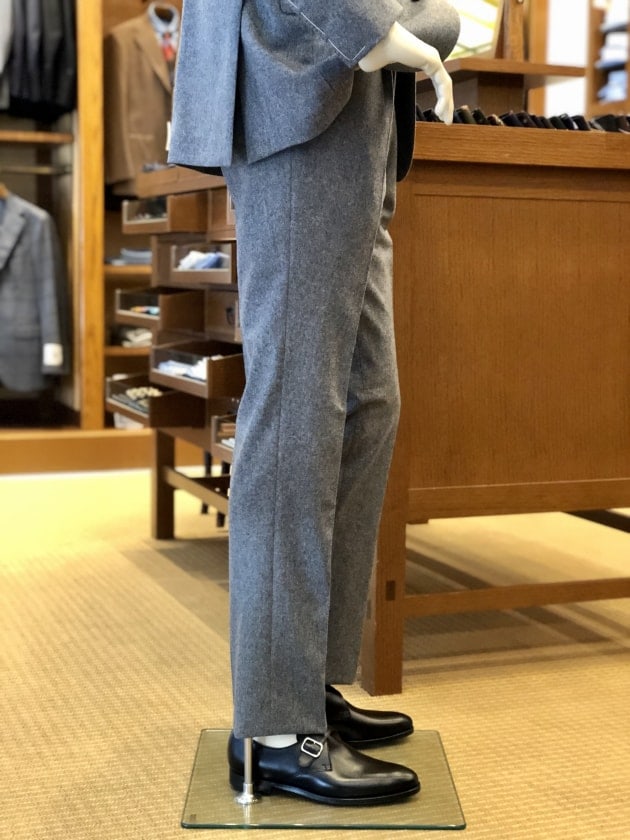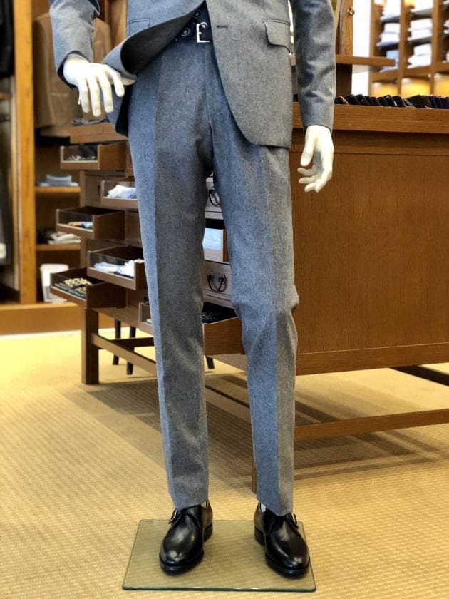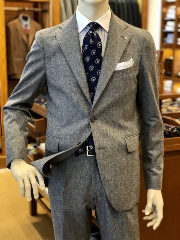ライトグレイのフランネル生地は、その質感に反して軽快な印象が魅力的です。これからの季節は特に重たい色が増え、皆様のお手持ちのスーツも暗い色になりがちではないでしょうか。お仕事上、致し方ない場合はありますが、可能であれば是非挑戦していただきたい色です。