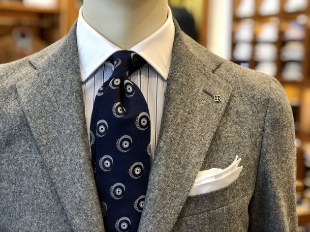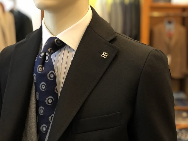 コートを含め、モノトーンのスタイリングといきたいところでしたが、長崎店でご用意できるブラックベースのネクタイだとスーツとの対比が強すぎて、ネイビーベースのジャカード織りの小紋柄にしました。シャツがグレイベースのホワイト×ネイビーのストライプだった為、ネイビーベースのネクタイがしっくりきました。ネクタイの柄の中には、グレイやブラックの色が使われ、全体に色がまとまったと思います。