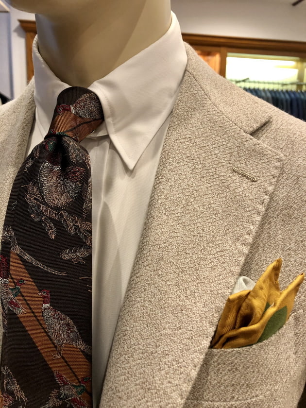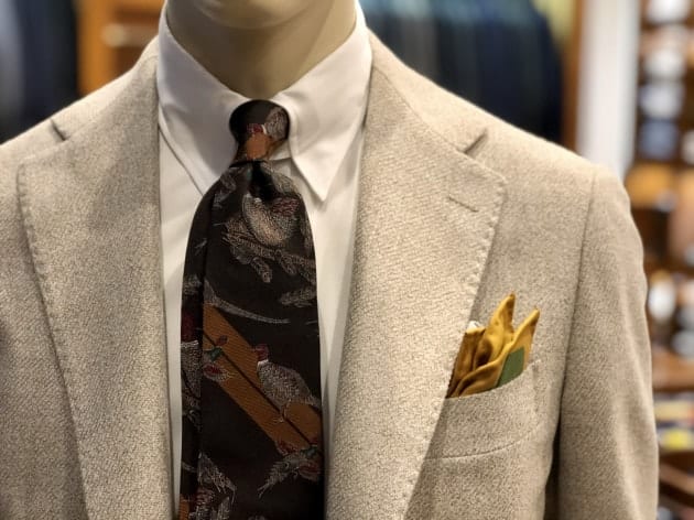 暖色系のレジメンタルストライプや小紋柄などのネクタイであれば、ほぼ網羅できるコーディネートの幅があり、今回のようなカモ柄はツウ好みとしか言いようがありませんが、シンプルに組み直せばビジネスにも対応可能です。
