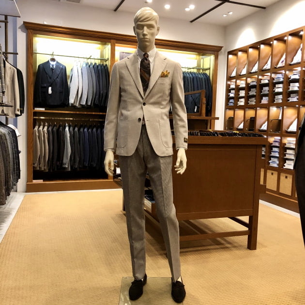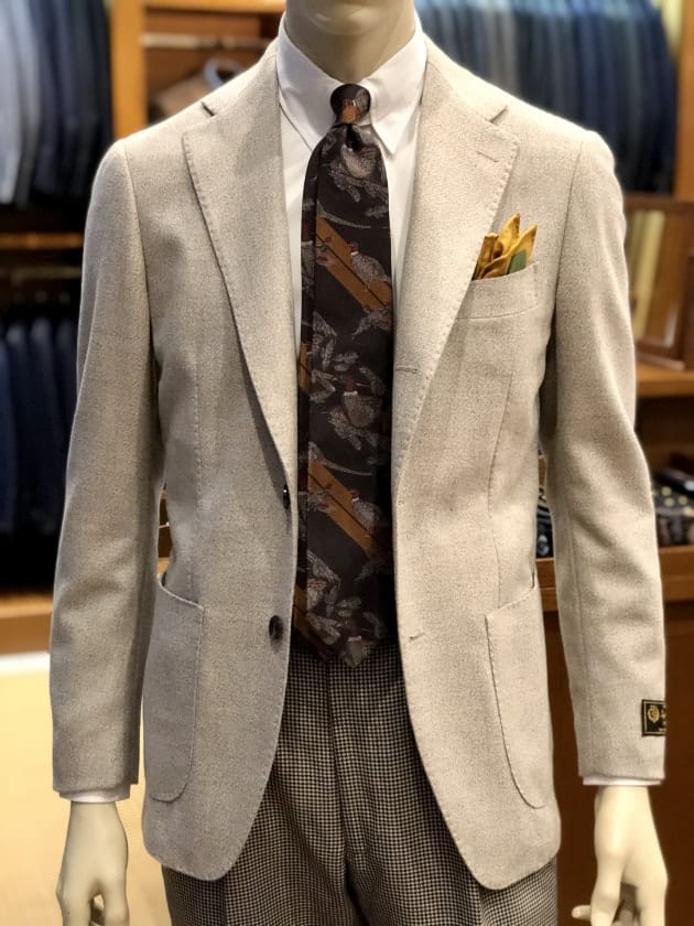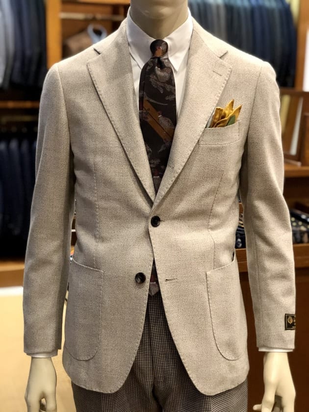 〈Brilla per il gusto(ブリッラ ペル イル グスト)〉のナチュラルカラーをベースとした風合い豊かなメランジが、なんとも優しく包み込んでくれるジャケットです。お若い世代の方にはやや難易度の高い色かもしれませんが、タイドアップのみならず、タートルやクルーネックなどのニットにも対応できる極めて汎用性の高いジャケットです。