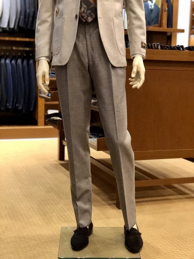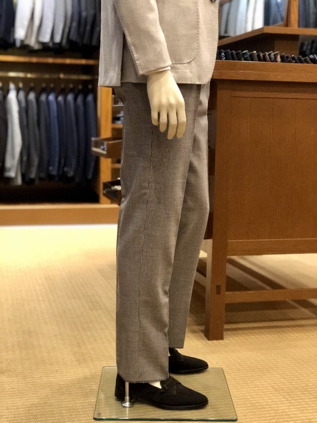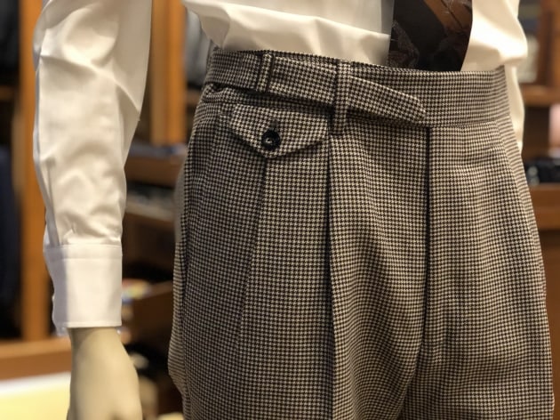 〈GERMANO(ジェルマーノ)〉のハウンドトゥース柄の片グルカパンツです。長い長い持ち出しを右横のバックルへ通し、正面へ戻すというとても個性的なパンツは、グルカパンツディテールを踏襲したドレスパンツと言えます。ナチュラルカラーのジャケットと相性が良く、今回のベージュ×ブラウンのハウンドトゥースは、ホワイト×ブラックの色違いとはまた違う落ち着いた表情を見せ、深い股上とゆっくりとしたシルエットが、クラシカルな雰囲気を一層深めています。