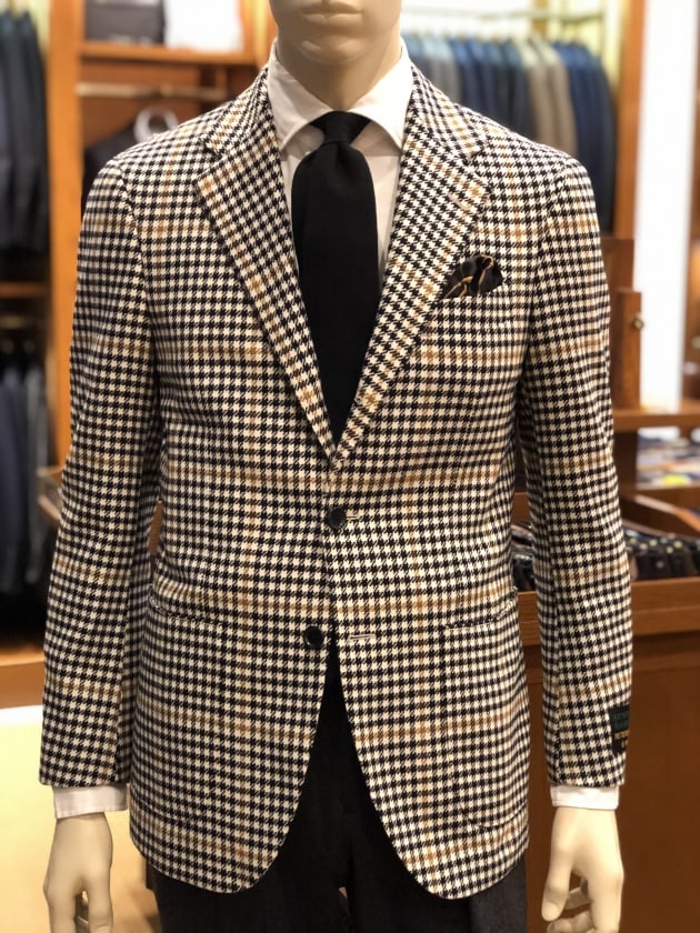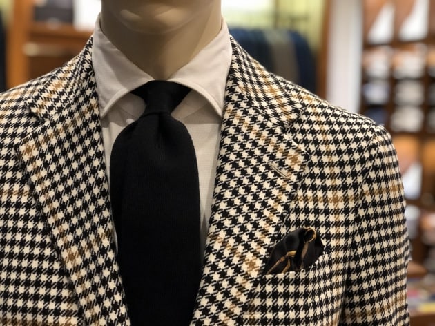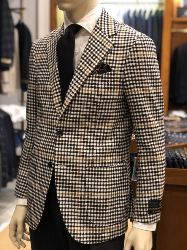 今シーズンを間違いなく象徴するモノトーンのシェパードチェックに、マスタードカラーのペーンが大きく入った〈BEAMS F(ビームスF)〉のジャケットです。英国ARTHUR HARRISON(アーサー ハリソン)の生地を以ってしても、軽快な着心地をご提供できるのは、〈BEAMS F〉の最大の強みと言えます。ペーンの色を拾うコーディネートが散見されますが、私は一切拾わず、むしろモノトーンに固執して、ペーンを更に強調しました。あえて言うならば、ポケットチーフで少し色を拾いました。表記上はグリーンですが、ブラックベースの部分のみをパフで出し、装飾品がプリントされたゴールド部分を覗かせています。
