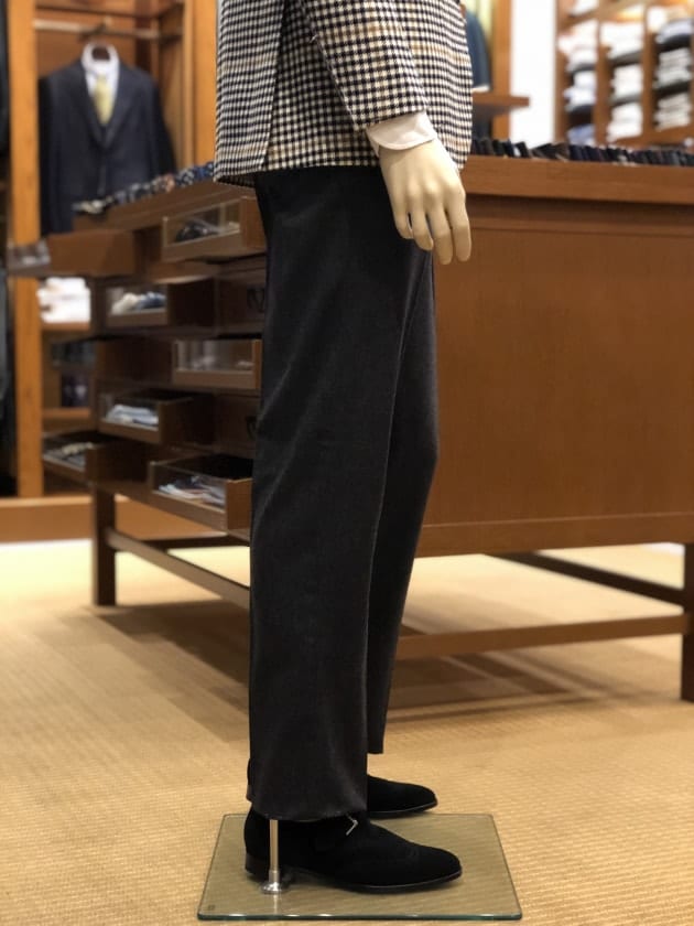 〈GTA(ジーティーアー)〉のワイドシルエットモデルSERGIO(セルジオ)のパンツです。正直に申し上げて、チャコールグレイのパンツがこちらしかなかった為、致し方なく選びました。ワイドかスリムどちらでも良いので、チャコールグレイのパンツが1番マッチすると思います。もちろん、SERGIOもお勧めのパンツですよ。