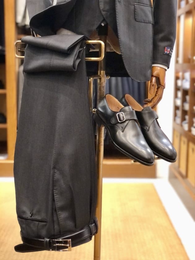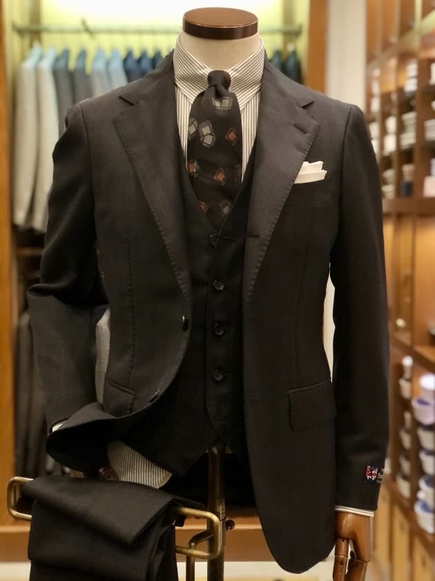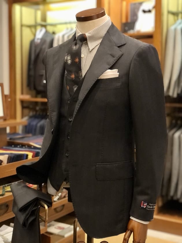 〈Brilla per il gusto(ブリッラ ペル イル グスト)〉の3ピーススーツです。1.2㎝ピッチのヘリンボーンが目立たずとも、さりげない立体感、高級感を生み出し、英国製の生地による3ピーススーツは、なんとも重厚で威厳のある空気を纏っています。総ハンドステッチによる細かい仕事が、温かみのある表情を生み出し、フルキャンバスによる根の強さに見えない魅力があります。拘りに溢れながらも決して人に押し付けない、本当は偉いのに威張らない、厳しさは時として優しさ…。そんな素敵なスーツです。