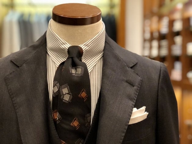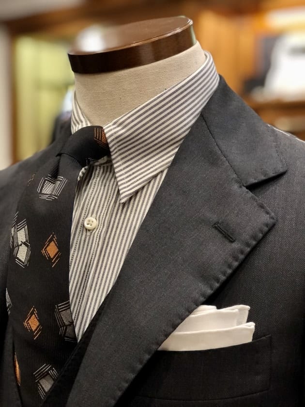 当分、モノトーンなスタイリングから離れられそうにない気がしています。少し前の〈GUY ROVER(ギローバー)〉のグレイストライプのタブカラーシャツに、〈BEAMS F(ビームスF)〉のブラックをベースとした小紋柄がキュートなネクタイを合わせています。ネクタイの生地は、世界屈指のシルク織物メーカーで、今年で創立300年周年を迎えた英国STEPHEN WALTERS(スティーブン ウォルターズ)社のものです。クラシカルな柄でありながら、現代の雰囲気に落とし込み、ワンポイントにオレンジが効いています。画像を拡大しないとわからない小さな部分の拘りが垣間見えますので、是非ご覧下さいませ。