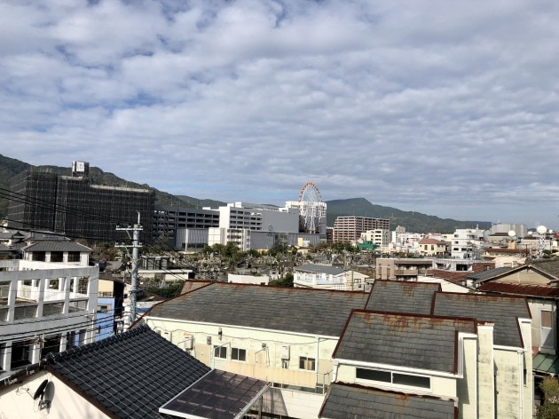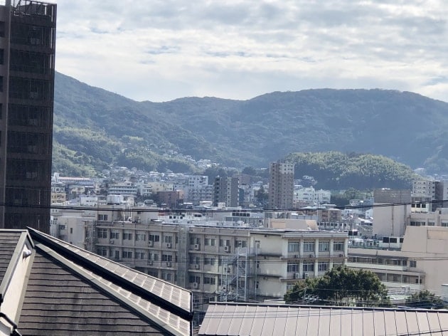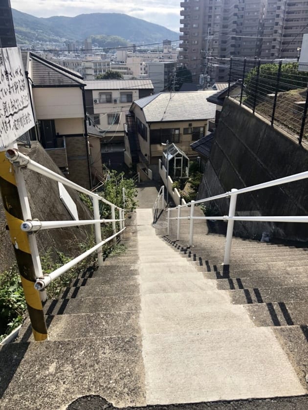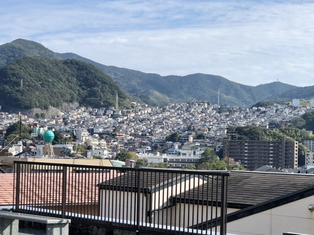 坂と階段、まあまあ登りました。良い景色です。有名な丸善団地も見えます。2枚目の右の手前の山、3枚目の丸善団地の左の山、そして私達が到着したこの山には、長崎の開港よりもっと昔、豪族が城(砦)を築いて縄張りを示していました。今は普通に見える山にも歴史があると思うとドキドキします。