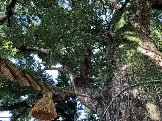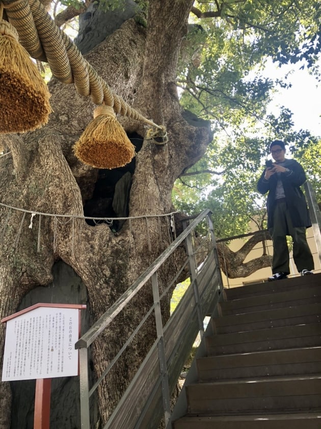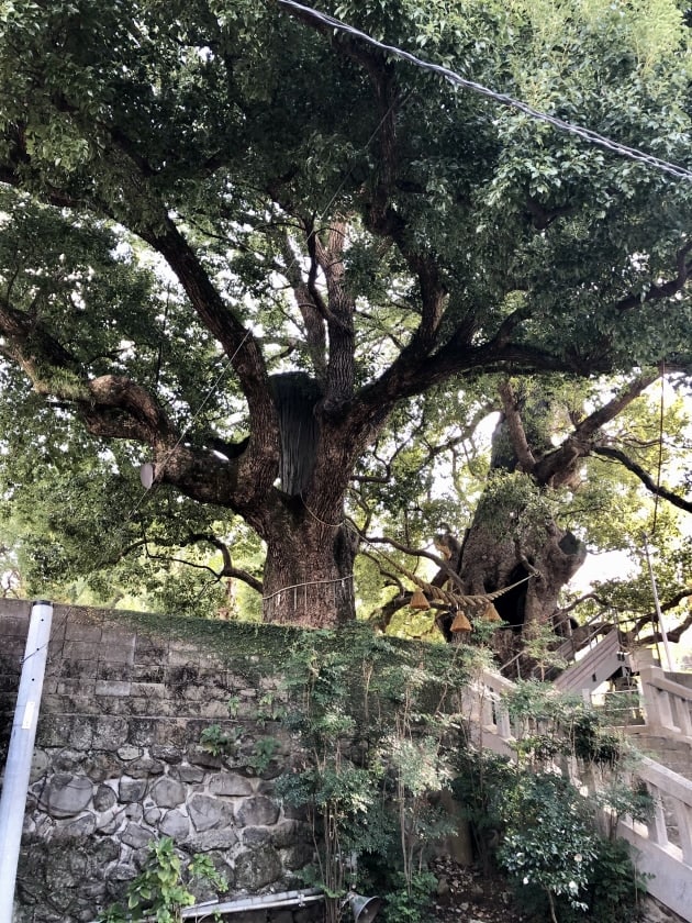 そして、山王神社へ旅の安全をお参りして、被爆クスノキの偉大な生命力に感動。原爆投下後、幹には亀裂、枝葉は吹き飛び、表皮は熱線で焼かれ、枯死寸前だったクスノキは75年の時を経て、樹勢を盛り返しています。長崎市外生まれの高屋が、幼き頃に学校行事で来た事がある、と思い出にふけっていました。