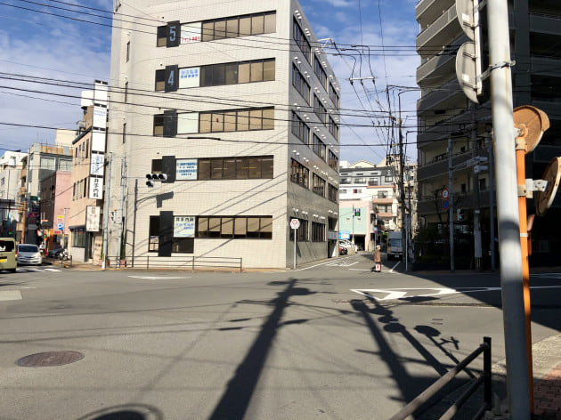 更に真っ直ぐ歩くと、ここに出ます。長崎大学病院下、浜口町の交差点です。ちなみにこの辺りが浜辺だった事に由来します。戦前は、路面電車の電停がこの辺りにあり、多くの学生が路面電車を利用して現在の長崎大学医学部裏門(元正門)まで歩いていたそうです。正面の道が街道です。