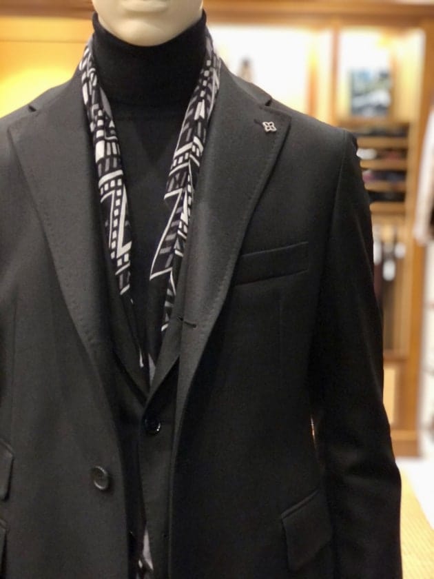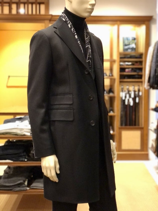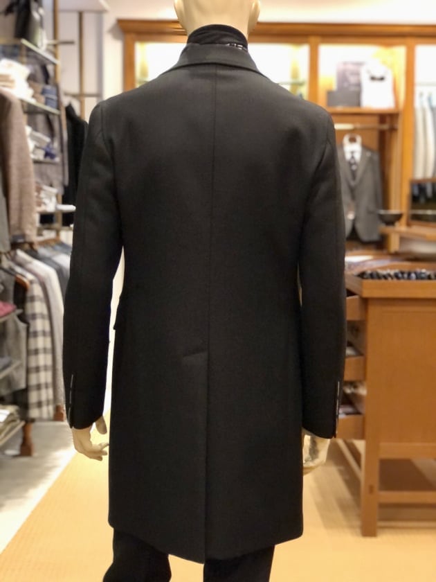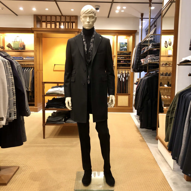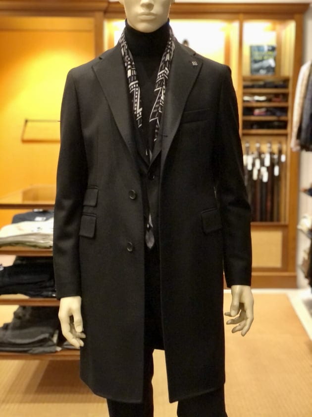Vol.9でもご紹介した〈TAGLIATORE(タリアトーレ)〉のブラックのチェスターコートです。お仕事から冠婚葬祭まで万能に使えるブラックは、シンプルが故に生地やシルエットに大きな差が出ます。特に〈TAGLIATORE〉の場合、卓越したカッティングに基づくシルエットが最大の魅力なので、ジャケットの上から羽織っても肩が潰れない十分な肩周りのスペース、高い位置で絞られたウエスト、同時にポケットの位置が高く、ベントも深いです。それらを踏まえ、皆様の体型を見事にサポートしてみせます。今回は、ブラックスーツの上に羽織っていますが、例えばローゲージのタートルネックニットの上に直接羽織るも良し、更に崩してパーカーの上に羽織るも良し、お堅いようで実は崩し甲斐があります。
