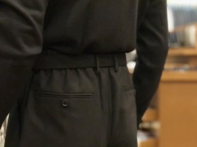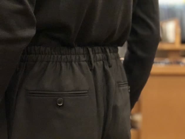 ジャケット同様に緩やかなシルエットを描くパンツは、先述の通り、生地の特性と相まって抜群の履き心地をお届けします。そして最大の特徴は、ウエストのシャーリングです。背面のみに施されたゴム仕様は、正にEASY WEARの体現に相応しい仕様と言えます。