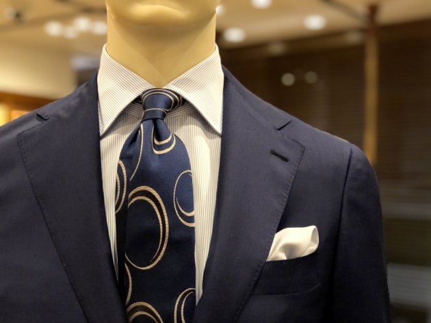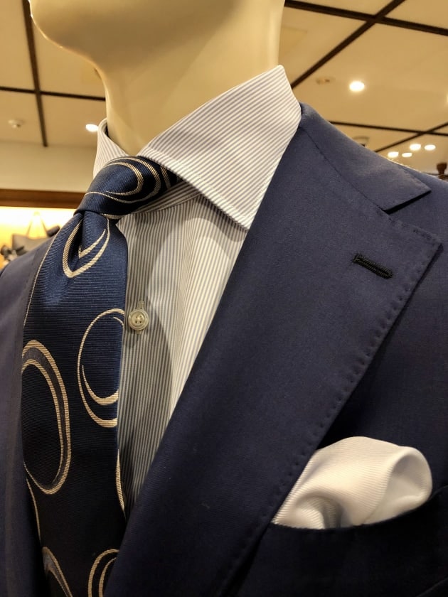 春になると恋しくなるブルー系のシャツやネクタイは、今シーズンも健在です。〈Brilla per il gusto(ブリッラ ペル イル グスト)〉のライトブルーのキャンディストライプシャツと〈FRANCO BASSI(フランコバッシ)〉のブルーを基調としたサークル柄のジャカードネクタイが、スーツのライトネイビーを同系色ながら引き立て合います。