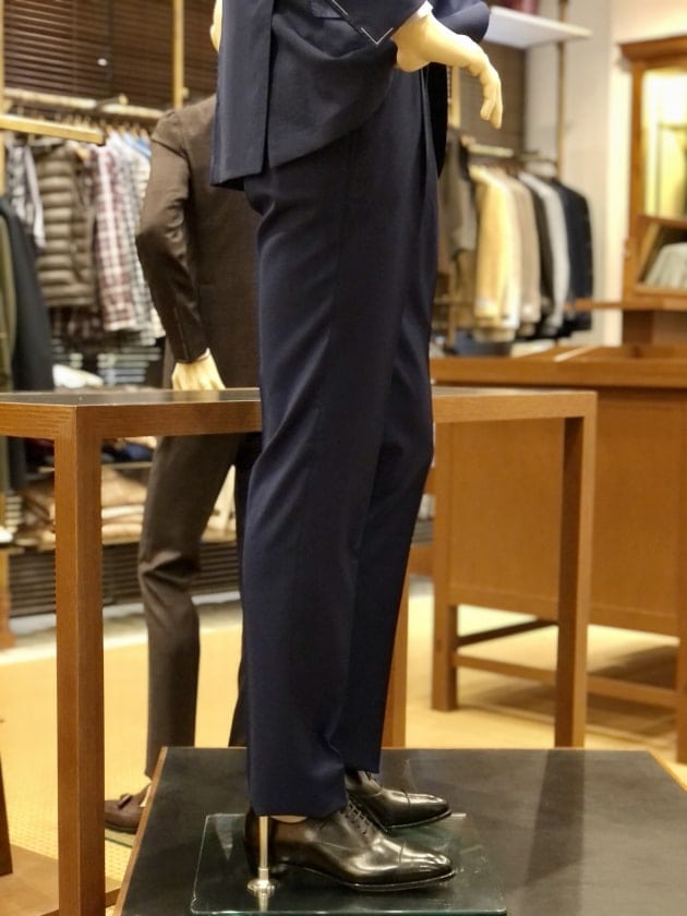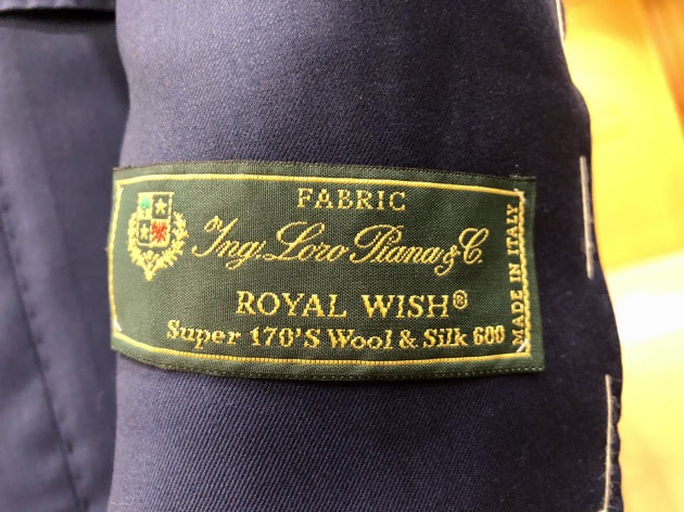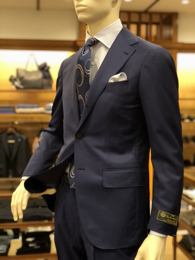 近年の春夏シーズンには欠かせないライトネイビーのスーツは、今シーズンも特に外せない色の1つです。綺麗な色にも目を惹きますが、触ると一発で虜になります。LORO PIANA(ロロ ピアーナ)社のROYAL WISH®︎(ロイヤル ウィッシュ)コレクションは、Super170’Sの超極細ウール95%にシルクを5%ブレンド、溶け落ちそうな滑らかさと深い光沢が妖艶な色気を纏っています。まず、ハッキリと申し上げておかなければならない事は、毎日はもちろん3日に1回でもハイペースです。週1回でもやや不安、隔週に1回ほどでちょうど良いくらいかと。それほどに繊細なので、例えゆっくりペースだったとしても、1回がハードなご使用であれば万が一があり得ます。しかし、ハッキリと申し上げますが、既製品では滅多にお目にかかれない最高級の生地故に、その着心地は昇天するほどの幸せな気分をお約束します。