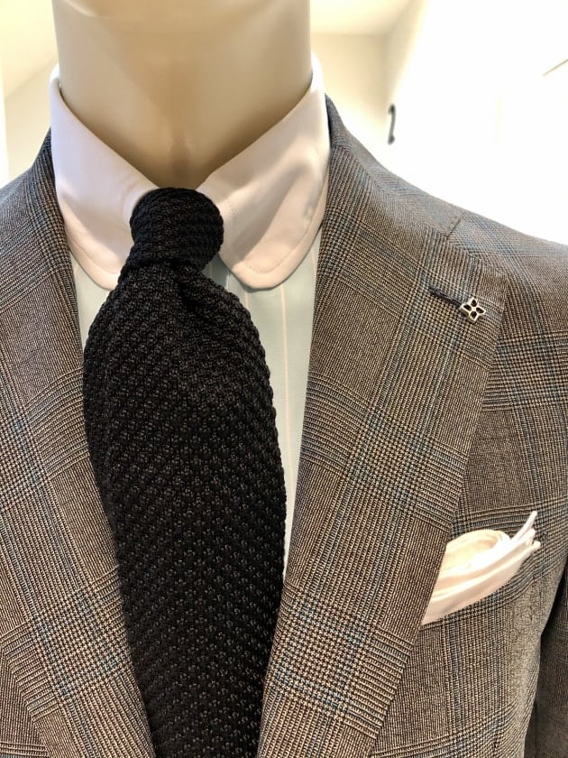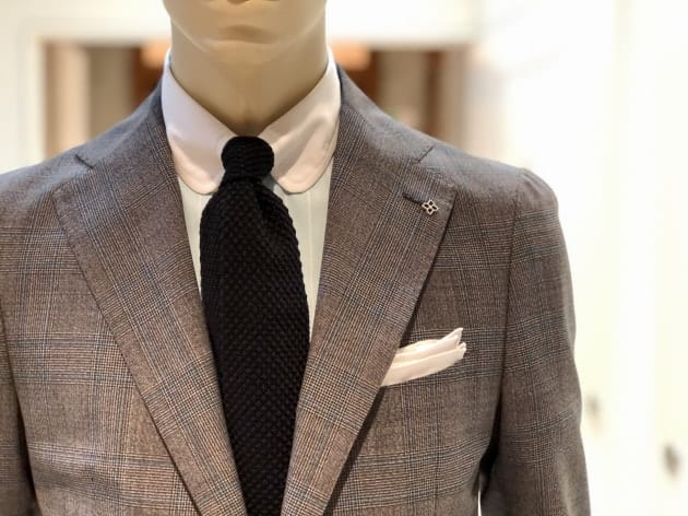 クラシックなスーツにはご法度とされるニットタイですが、ガチガチに決め込むほどのお堅い印象を全く受けない為、理解した上であえてのニットタイ、しかもブラックで引き締めつつも軽快になるようバランスを取ってみました。剣ありのニットタイなのでギリギリセーフかなと…。