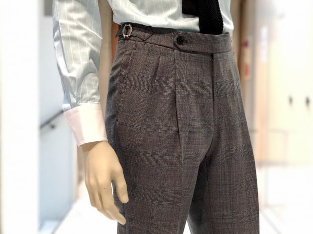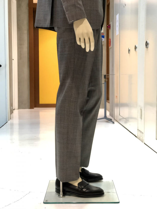 〈TAGLIATORE(タリアトーレ)〉のターコイズブルーのペーンが効いたグレンチェックのスーツです。ライトグレイより暗く、ミディアムグレイより明るい春夏らしい軽快感のある絶妙なグレンチェックに、更にターコイズブルーのペーンが清涼感を演出します。近年注目の「モノトーン+カラー」を一着で完結させたようなトレンドど真ん中、という解釈もありますが、私にとってカラーペーンの入る生地はとてもクラシックな印象があり、流行っても廃れない良さがあります。加えて、ベルトレスパンツを採用している点でも、そのクラシック度合いが窺えます。