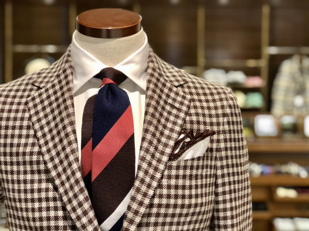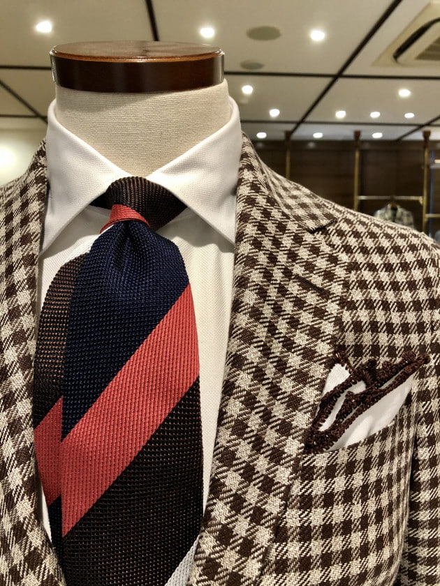 ビジネスシーンに適応すべく、シャツはシンプルにホワイトのワイドカラーシャツで合わせてみました。ブラウン系ジャケットなので、同系色のブラウンや近年ではイエローなどのネクタイが相応ですが、鮮やかなピンクに惹かれて自然と手が伸びてしまった今回のネクタイは、〈FRANCO BASSI(フランコバッシ)〉のネイビー×ブラウン×ピンク×少しホワイトの絶妙な配色が新鮮です。加えて、ジャケットの生地感に合わせて、ネクタイにも立体感と清涼感のあるフレスコ織りがよく合います。