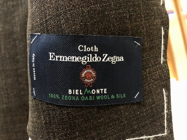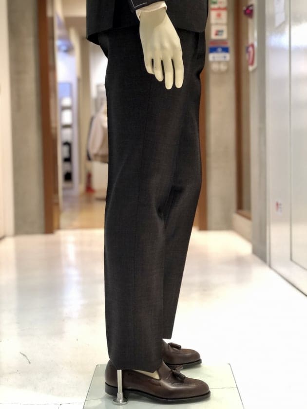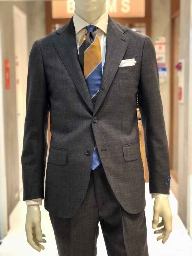 〈Brilla per il gusto(ブリッラ ペル イル グスト)〉のスーツです。ブラウンソリッドの渋い雰囲気は、豊かな表情を演出するメランジ織りにより、無機質に感じさせない温もりがあります。温もりと言っても温かい訳ではなく、Ermenegildo Zegna(エルメネジルド ゼニア)社が2020秋冬にリリースしたBIELMONTE(ビエルモンテ)という生地は、英国製張りのハリコシに優れ、通気性と復元性に特化、リネンやモヘアを混紡しているかのようなドライタッチが特徴です。近年、各大手生地メーカーが積極的に取り組む環境保護活動ですが、その一端を担う今回のBIELMONTEコレクションは、Ermenegildo Zegna社が工場を構えるイタリア・ヴィエラ地方の保有する森林地帯がゼニアのオアシスを意味するOASI ZEGNA(オアジ ゼニア)と呼ばれ、OASI ZEGNA内で飼育される羊の原毛のみを使用しています。加えてシルク12%を混紡、ハリコシツヤの三拍子が揃う大変魅力的な生地です。