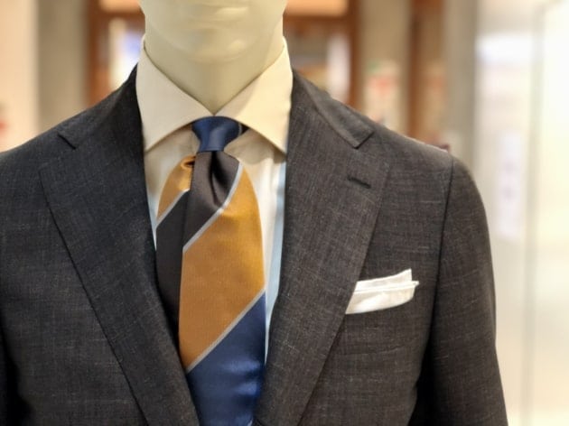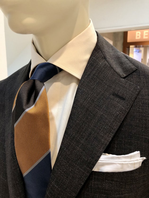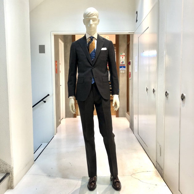 サックスブルーやラベンダーなどのドレスシャツは定番色として見かけますが、ボタンダウンではないイエロー系、今回はベージュ表記ですが、ワイドカラーのドレスシャツが久々の登場で新鮮です。今回のようなブラウンのスーツとは同系色なので、抵抗なくお召しになれますし、お持ちのネイビー系のスーツやジャケットと合わせて、色の対比を楽しむのも気分です。ネクタイは、ビンテージライクな小紋柄が今の気分かもしれませんが、ネイビーやグレイのスーツが二大巨頭と位置づけるならば、ブラウンはその次に位置し、スポーティーな印象があります。故に、元気な色で構成されたストライプのネクタイで、春らしく活発な印象を意識して組んでみました。